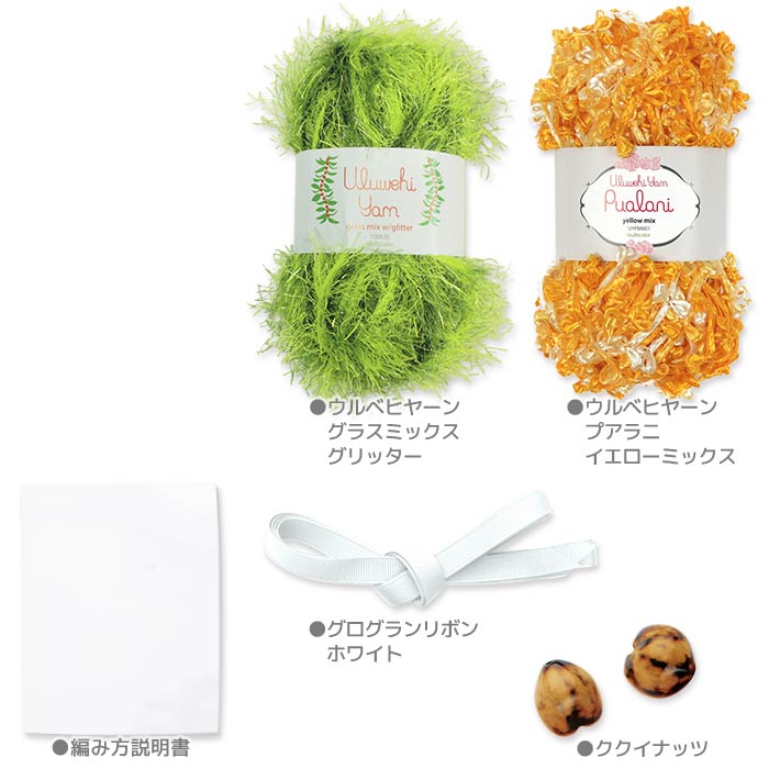セット内容 ウルベヒヤーン 1色(グラスミックスグリッター) ウルベヒヤーンプアラニ 1色(イエローミックス) グログランリボン 1.5ヤード(ホワイト) ククイナッツ 2個 編み方説明書 監修池田ひさこ ※こちらのキットにかぎ針は付属しません。