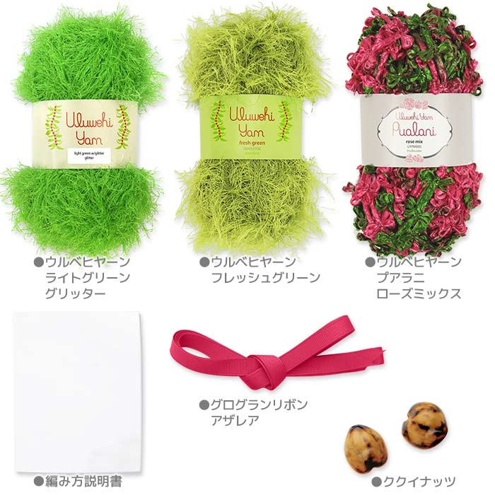 セット内容 ウルベヒヤーン 2色(ライトグリーングリッター、フレッシュグリーン) ウルベヒヤーンプアラニ 1色(ローズミックス) グログランリボン 1.5ヤード(アザレア) ククイナッツ 2個 編み方説明書 監修池田ひさこ ※こちらのキットにかぎ針は付属しません。