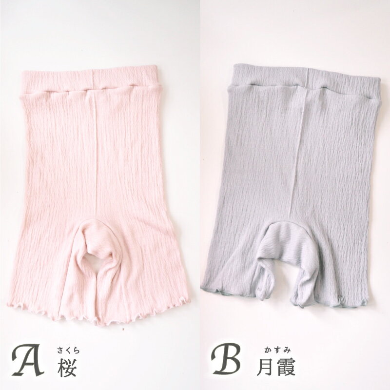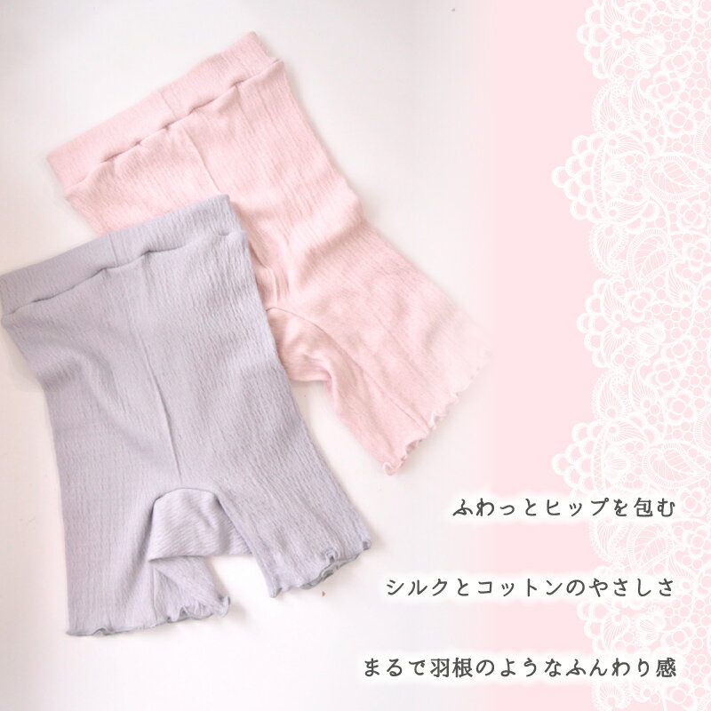 絹肌衣 3分丈ショーツ サイズ(平置き) ヒップ 87〜95 Mサイズ 縦30×横23 クロッチ幅 5.5 (おりものライナーがぴったり装着可能) 素材 ・本体 絹 50%(内側) 綿 47%(外側) ポリウレタン 3% ・クロッチ部分 シルクニット100% オーガニックコットン 100% カラー ・桜 (ピンク) ・月霞 (グレー) オススメポイント ・ふんわりゴムなしウエストで履き心地、ふんわりゆったり3分丈ショーツ。